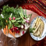 This recipe offers a whole new spring temptation! If you cannot find white asparagus, use thick green asparagus stalks. If you are using white asparagus, peel off the outer skin, beginning with the leaves just under the tip, where grit may be hiding. Hold each stalk up to the light so you can be sure you’ve removed all of the tough skin. You may need to peel each stalk twice to be sure. Then, trim off the end of the stem.